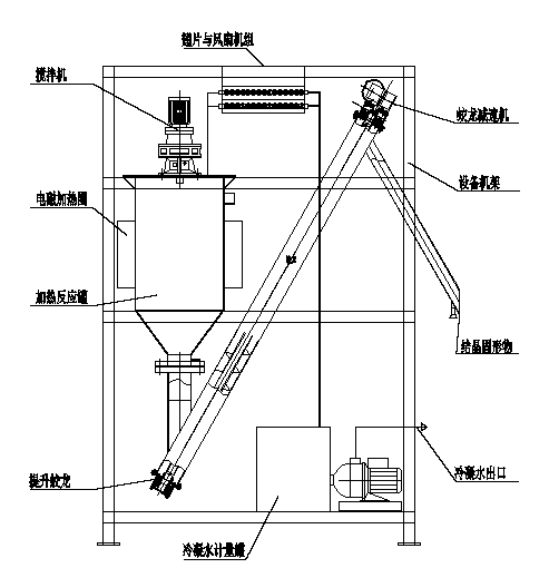 電磁結晶蒸發器主要由進料氣動泵、電磁加熱、蒸發反應罐、彈簧刮刀攪拌器、抽風機、冷卻翅片風扇、蛟龍出料裝置、監測控制儀表組成,最終實現全自動運行的電磁結晶蒸發器。