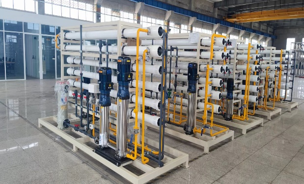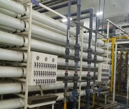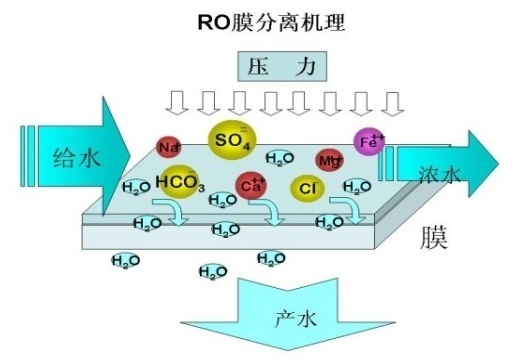 反滲透(RO膜系統(tǒng))是60年代發(fā)展起來的一項(xiàng)新的薄膜分離技術(shù),是依靠反滲透膜在壓力下使溶液中的溶劑與溶質(zhì)進(jìn)行分離的過程。對于除鹽系統(tǒng)來說,預(yù)處理水進(jìn)入反滲透膜,在高壓力的作用下,小分子(如水分子)透過半透膜進(jìn)入淡水室,大分子(如 Ca2+、Mg2+、Na+、SO42-、Cl-、HCO3-、HSiO3- 等離子)則留在濃水室,后排放。反滲透系統(tǒng)控制自動(dòng)控制,根據(jù)程序進(jìn)行過濾產(chǎn)水、加藥、停機(jī)沖洗。