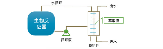 這種系統(tǒng)比較少的應(yīng)用于大規(guī)模項(xiàng)目中,主要使用萃取膜將污水與生物反應(yīng)器進(jìn)行隔離,利用萃取膜的選擇透過性,使目標(biāo)污染物透過,并進(jìn)入生物反應(yīng)器進(jìn)行降解,而有毒有害的物質(zhì)則被隔離。