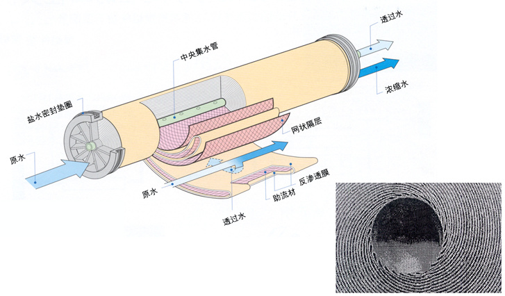 反滲透(Reveser Osmosis,簡稱RO)是以壓力為驅(qū)動(dòng)力,并利用反滲透膜只能透過水而不能透過溶質(zhì)的選擇性而使水溶液中溶質(zhì)與水分離的技術(shù),因?yàn)楹妥匀粷B透的方向相反,因此稱為反滲透。其工作壓力很高(1~25MPa)。
