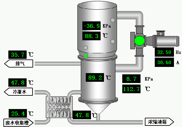 ③蒸發(fā)罐內(nèi)為-35至55KPA(可設(shè)定)負(fù)壓條件運(yùn)行,污水升溫至80-90℃開始沸騰,產(chǎn)生大量水蒸汽。